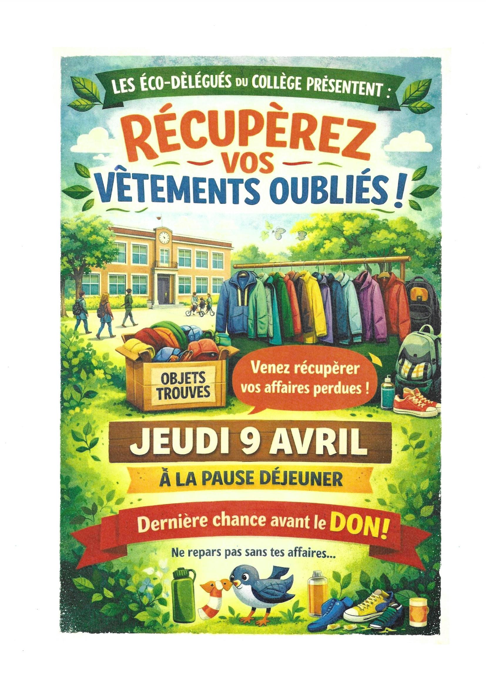 Venez récupérer vos vêtements oubliés jeudi 09 avril sur la pause déjeuner.